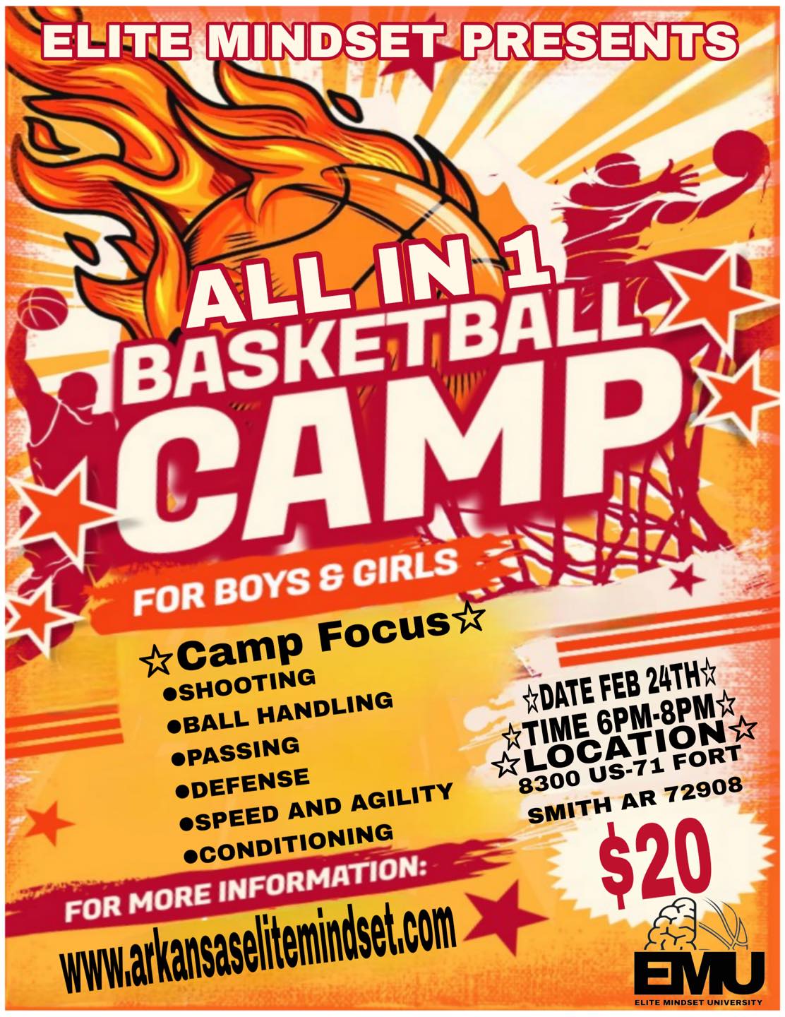 Feb 24th 6pm to 8pm. This basketball camp offers a comprehensive training experience focused on developing core skills. Our expert coaches will guide athletes through intensive drills and personalized instruction in shooting, ball handling, passing, defense, speed, agility, and conditioning. Participants will enhance their technique, foster teamwork, and elevate their overall game in a dynamic and supportive environment.